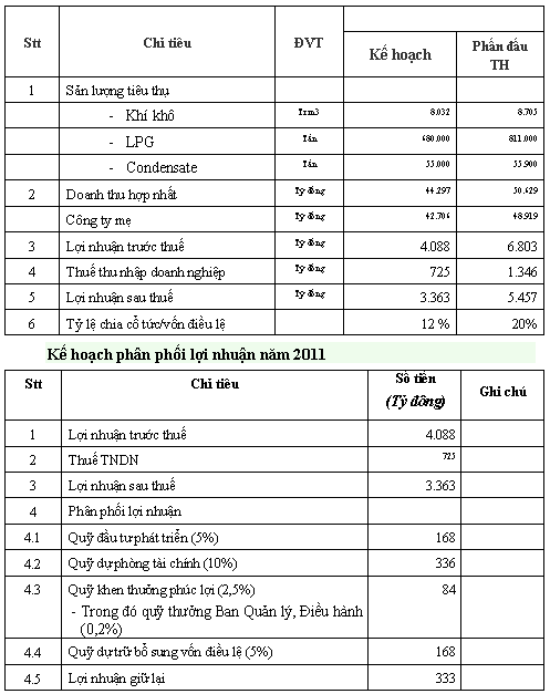 ĐHĐCĐ lần thứ Nhất Tổng Công ty cổ phần Khí Việt Nam đã thông qua các nội dung: Kế hoạch sản xuất kinh doanh, Kế hoạch phân phối lợi nhuận, Kế hoạch niêm yết cổ phiếu năm 2011 cụ thể như sau: