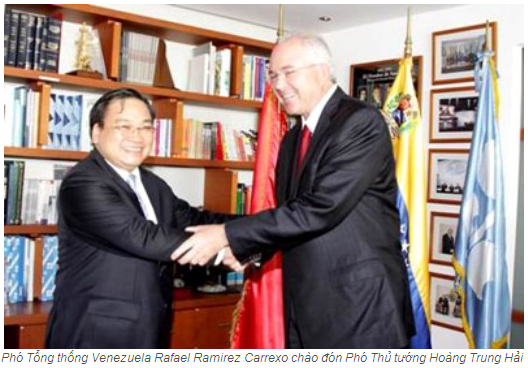Trong khuôn khổ chuyến thăm CH Venezuela, tham dự Lễ ký chính thức Hợp đồng liên doanh khai thác và nâng cấp Lô Junin 2 giữa ngành Dầu khí hai nước, chiều 29/6 (giờ địa phương) Phó Thủ tướng Hoàng Trung Hải đã có cuộc hội đàm với Phó Tổng thống kiêm Bộ trưởng Năng lượng Rafael Ramirez Carrexo và gặp gỡ Bộ trưởng Điện lực Ali Rodriguez.